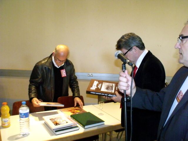 Puis le maire, Patrick PERON a remercié Jean-Luc MELENCHON pour sa présence à Algrange devant les photographes et sympathisants présents, et lui a offert plusieurs livres sur la vallée. Celui de la S.M.K. de Michel Colica, offert par l'imprimerie KLEIN de Knutange, mon livre sur Algrange offert par le maire...