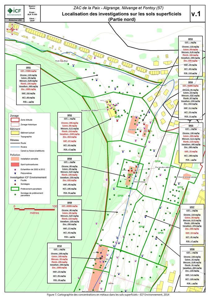 Outre la présence généralisée de traces organiques souillées par des métaux lourds et d'hydrocarbures, cette étude approfondie du sous-sol a fait apparaître des fosses et des galeries non remblayées ou comblées et surtout fortement polluées.... Les fouilles effectuées sur le sol et les nombreux remblais ont mis à jour des " vestiges " industriels, remblais " cache-misère ", démolitions incomplètes, restes de fondations des anciennes installations sidérurgiques..