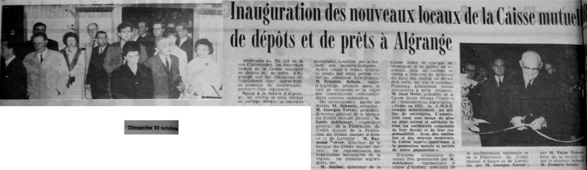 Sur l’initiative du curé SCHANG, la C.M.D.P. d’Algrange a été fondée en 1927 par une poignée d’hommes de cœur ayant pour idéal : " moi pour toi, toi pour moi ". Elle changea de lieu à plusieurs reprises. Tout d’abord, au 20 rue Jean Burger, puis au 5 place de la République, (en dernier magasin de la presse : WELFERINGER et avant RODA avant de devenir bureau de poste depuis 1999) puis au 1 rue du Cimetière, au-dessus du magasin d’alimentation pour bétail et depuis le 22 octobre 1966, au 112 rue Clemenceau. En juillet 1990, de nombreux logements furent détruits par le feu au 114 et 116, rue Clemenceau. Les immeubles de l'entreprise HOLTZINGER et du café furent rachetés par la CMDP et détruit en 1991 pour pouvoir faire une extension de la banque.
