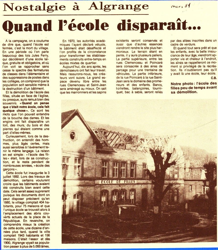 En 1970, les autorités académiques déclarèrent cette école vétuste. Le bâtiment fut désaffecté et l’on profita de la circonstance pour transformer les autres établissements en école mixte de quartier. Avant d’être détruite elle servie également de dortoir lors des échanges franco-allemand où des jeunes Allemands venaient pour entretenir les tombes de militaires au cimetière d’Algrange. En 1981, cette école fut démolie et ce grand espace devenu libre, entre les rues Clemenceau et saint Jean, fut aménagé au mieux.