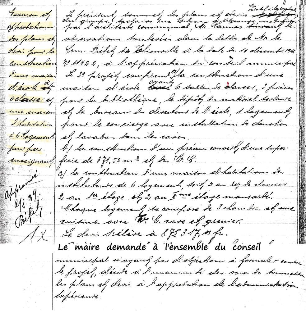 Dans une enquête, l’Inspecteur d’Académie souligna le peu de volonté de la municipalité d’assainir une situation qui durait depuis plusieurs années. Il remit en avant l’idée de construction d’un nouveau bâtiment en notant qu’en aucun cas les locaux actuellement utilisés de façon précaire ne le seraient de façon définitive.