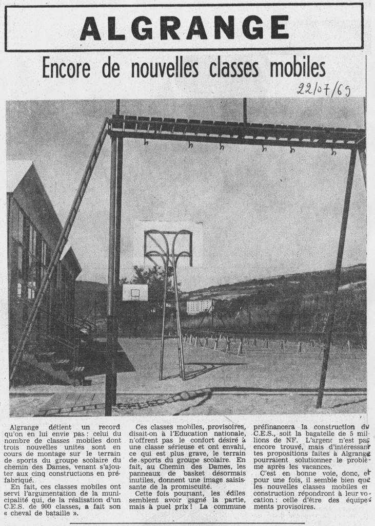 En 1969, le canton d’Hayange, bien que le plus peuplé à ce moment, des quatre départements lorrains, ne comptait aucun C.E.S. Pour combler ce retard, le département accepta exceptionnellement de financer 4 C.E.S., dont deux dans la région hayangeoise. Algrange eut l’un d’eux, mais il fallut, en pleine période d’encadrement de crédits, trouver l’argent nécessaire. Il fallait 5.700.000 francs pour son édification, équipement intérieur non compris. 900.000 francs étaient à la charge de la commune. La perspicacité de la municipalité algrangeoise a joué à plein, puisqu’elle obtint les emprunts nécessaires et le premier coup de pioche fut donné le 8 avril 1970.