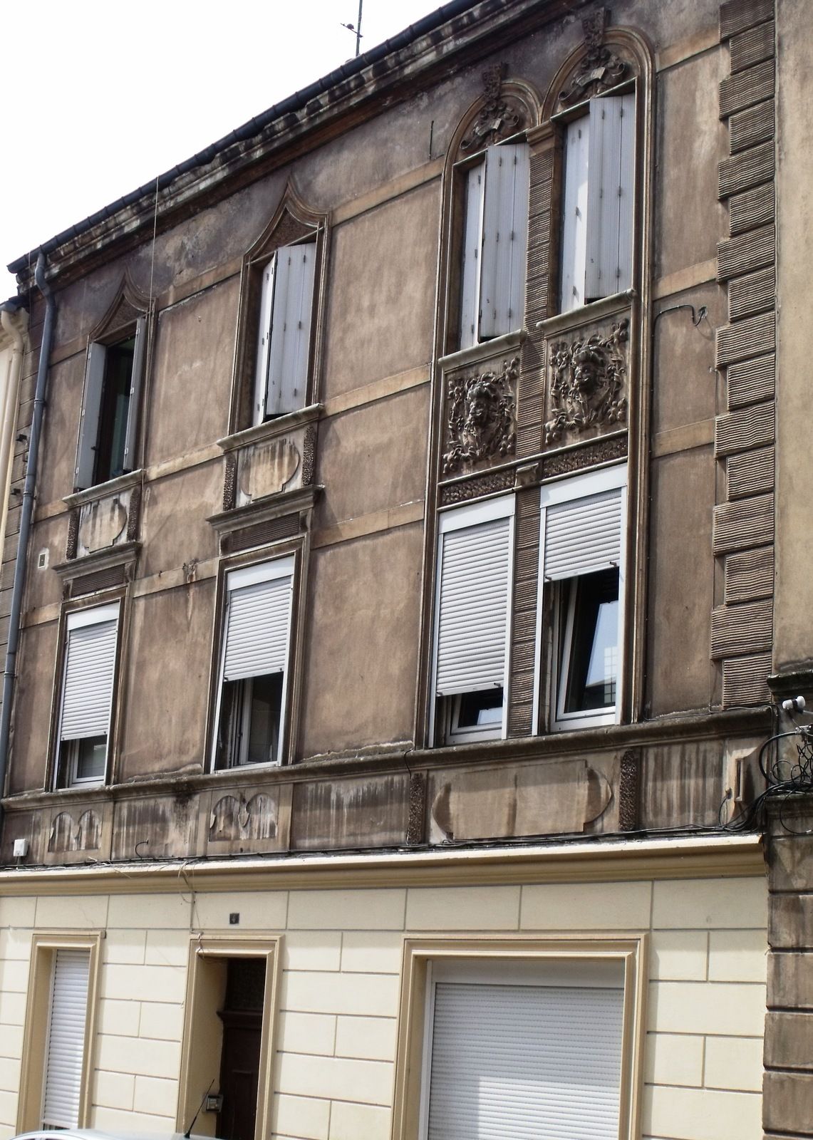 Motif entre les fenêtres du premier étage et celles du second étage, à gauche. Deux têtes d'homme avec moustache et coiffe....