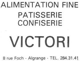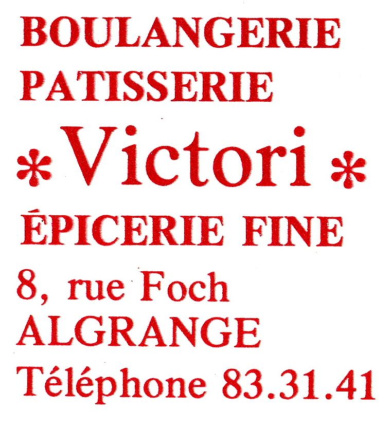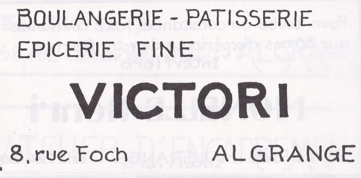 Le 1er mai 1919, Joseph VICTORI et son épouse Thérèse (née FRIEDERICH) natifs de Rosheim (Bas-Rhin), créaient une boulangerie au 62 rue Foch, où travaillèrent 5 personnes. A cette époque, le magasin était ouvert toute l'année et le fournil occupé 24h sur 24. La maison fabriquait toutes sortes de pains .... Le portage à domicile était déjà à la mode et, avec son cheval et sa voiture à pain, il parcourait les rues des cités minières de la commune. Dès la fin de la seconde guerre mondiale la vente de spécialités alimentaires s'était ajoutée à ce qui existait déjà. Madame VICTORI décéda en 1956 et Monsieur Joseph VICTORI en 1966...
